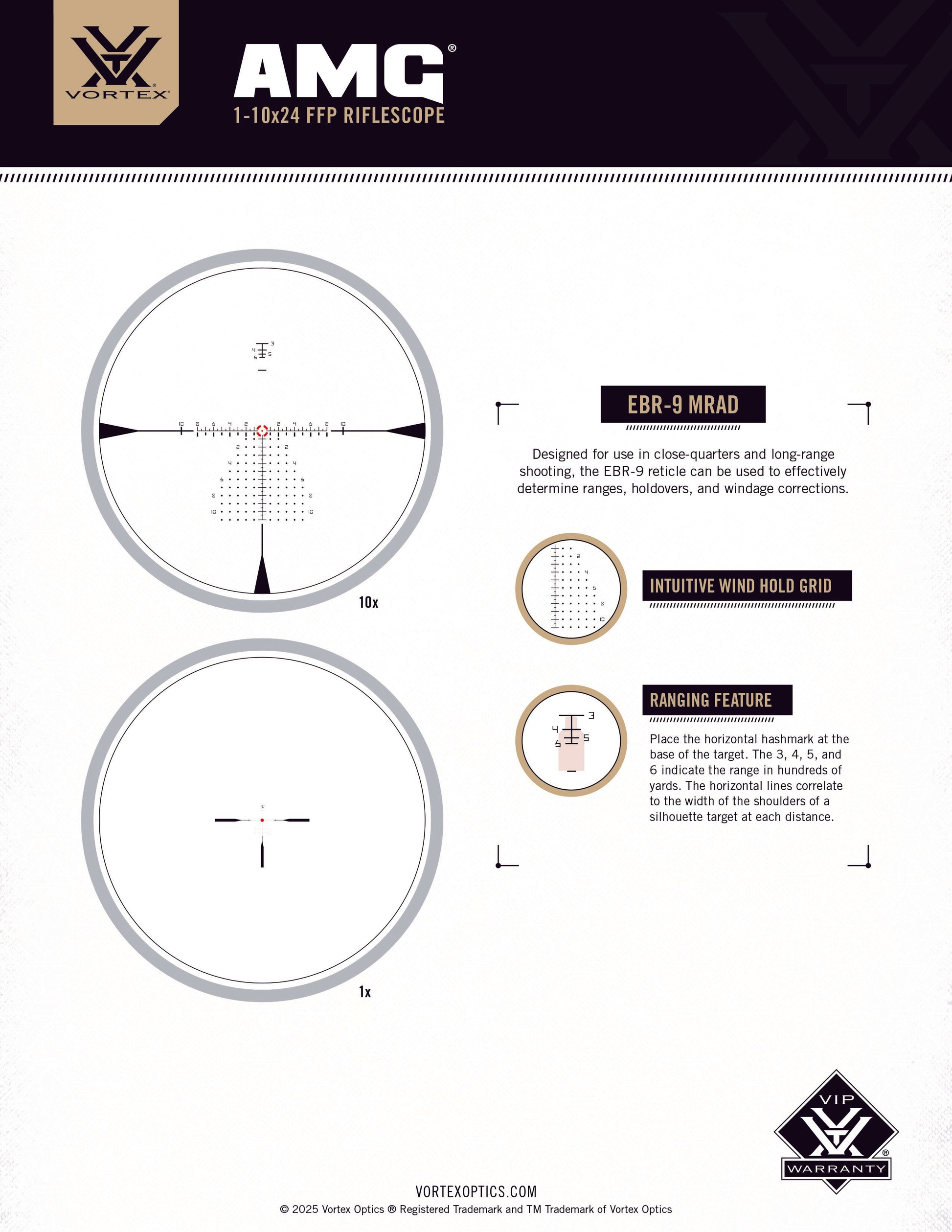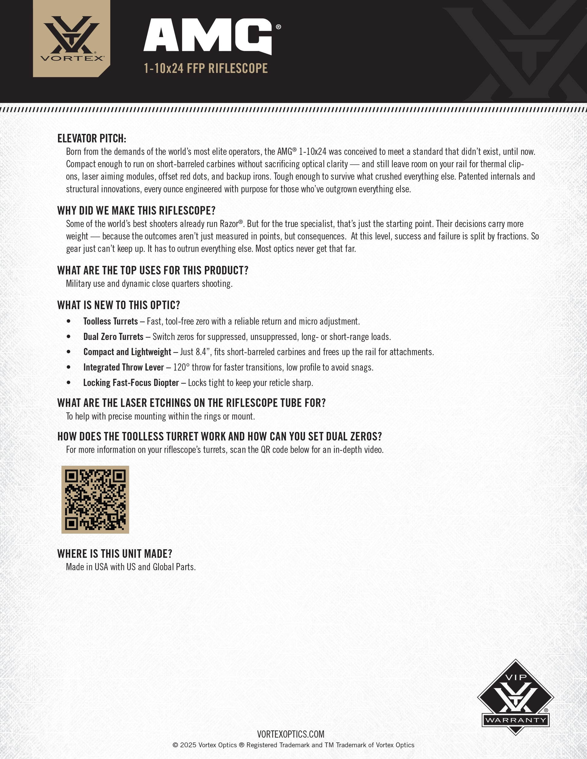 Born from the demands of the world’s most elite operators, the AMG® 1-10x24 was conceived to meet a standard that didn’t exist, until now. Compact enough to run on carbines fully equipped with thermal attachments, lasers, red dots, and backup irons. Tough enough to survive what crushed everything else. Patented internals and structural innovations, every ounce engineered with purpose for those who’ve outgrown everything else.